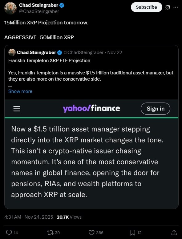 Czy rzeczywiście kolejne fundusze spotowe spowodują, że kurs Ripple odwróci kierunek i znowu zacznie rosnąć? Eksperci są raczej optymistami w tej kwestii. Chad Steingraber prognozuje, że XRP ETF od Franklin Templeton osiągnie aktywność handlową na poziomie 15 mlnd XRP. To prawdopodobnie przełoży się wolumen obrotu na poziomie 30 mln, a w przyszłości nawet na 50 mln dolarów.