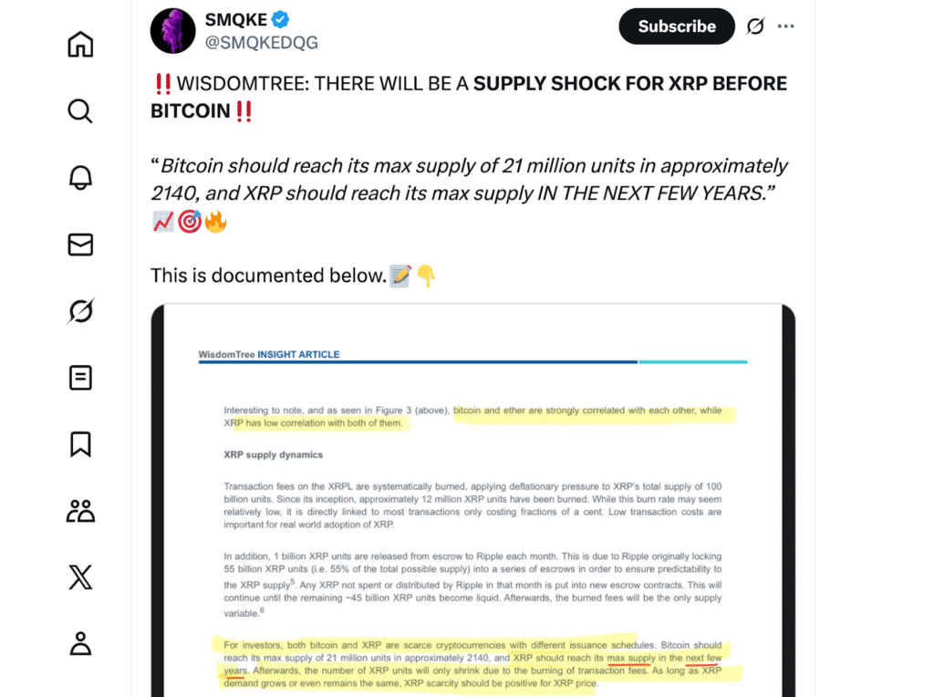 Obserwacja ta, ponownie ujawniona przez badacza społeczności SMQKE, wskazuje na szczegółowe informacje WisdomTree. Wskazuje to analiza z listopada ubiegłego roku, w którym porównano dynamikę podaży XRP do długoterminowego modelu niedoboru Bitcoina.