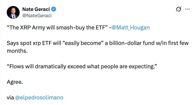 Specjalista ds. ETF-ów Nate Geraci powiedział, że produkt może „znacznie przekroczyć początkowe oczekiwania”. Podczas gdy Matt Hougan, dyrektor ds. informatyki Bitwise przewiduje, że będzie łatwo przewyższyć ETF-y Solana i Ethereum. „Rynek nie jest gotowy na to, co nadchodzi” – powiedział jeden z analityków. Dodał, że większość prognoz „wciąż nie docenia instytucjonalnego magnetyzmu XRP”.
