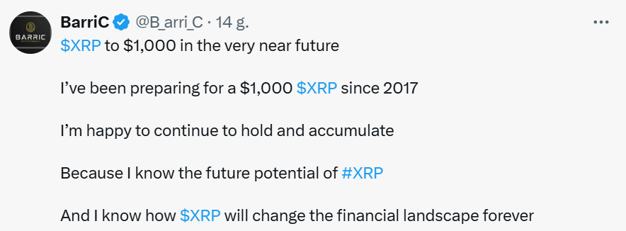 Ekspert BarriC z X’a jest hurraoptymistą. Kupowanie XRP dziś przypomina wejście w rynek przed jego historycznym rajdem w 2017 roku. Jego zdaniem bez większego problemu może przebić 3, 5, a nawet 10 czy 20 dolarów, jeśli tylko ruszy fala instytucjonalnych zakupów. „Wystarczy, że jeden duży bank zacznie używać XRP do przelewów i wszystko się zmieni” – podkreśla BarriC. Nie wyklucza też długoterminowego scenariusza, w którym osiąga 100, a nawet 1000 dolarów, jeśli technologia Ripple zdominuje międzynarodowe płatności.