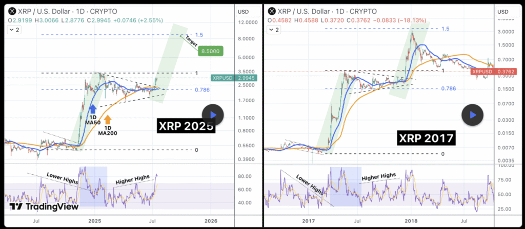 Aktualnie cena przebiła opór w postaci formacji trójkąta, a na horyzoncie widać “golden cross” – sygnał techniczny zapowiadający silne wzrosty. Według jego prognozy, XRP może osiągnąć nawet 8,50 USD jeszcze w tym roku, co oznaczałoby wzrost o ponad 140%.