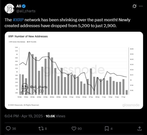 Jednak inni analitycy widzą pewne zagrożenia. Jednym z nich jest Ali Martinez, który w jednym z najnowszych postów na X zwrócił uwagę na słabość istotnego wskaźnika XRP. Jak poinformował ekspert sieć Ripple w ciągu ostatniego mocno się skurczyła. Liczba nowych użytkowników w sieci spadła z 5200 do zaledwie 2900.