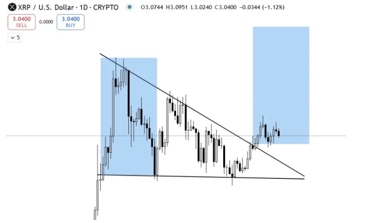 Według analizy technicznej, XRP właśnie wybił się z formacji zniżkującego trójkąta, co często sygnalizuje dalsze wzrosty. W lipcu, podczas podobnej sytuacji, token zyskał 66% w zaledwie trzy tygodnie.