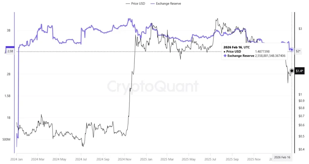 Chociaż kapitał znowu ucieka od XRP, to okazuje się, że największa giełda kryptowalut notuje właśnie najniższy poziom rezerw tego tokena od lat. Aktualne dane platformy CryptoQuant pokazują, że rezerwy Ripple na Binance wynoszą obecnie nieco ponad 2,5 mld. Ostatni raz takie poziomy giełda notowała w styczniu 2024 roku. W szczycie, w listopadzie 2024 roku, rezerwy sięgały 3,2 mld tokenów.