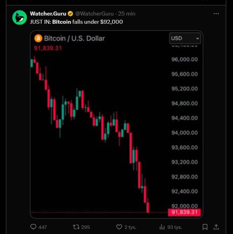 Bitcoin spadł do 92 tys. USD, a przez rynek kryptowalut przetoczyła się panika po tym, jak Wall Street na poniedziałkowej sesji kontynowało spadki z ubiegłego piątku. Powód? Donald Trump wznowił groźby nałożenia ceł na Meksyk i Kanadę. Przypomnijmy, że w ubiegły piątek indeksy w USA doświadczyły najsłabszej sesji w roku.