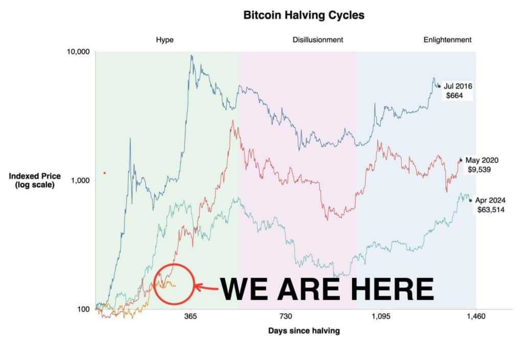 Przypomnijmy też, że historycznie hossy Bitcoina kończyły się mniej więcej rok po przebiciu ATH z poprzedniej hossy. Zatem marzec 2025 roku może być tą 'sądną’, graniczną datą, gdy inwestycyjne zaufanie do sektora crypto zostanie bardzo poważnie przetestowane. Jednak inwestorom wciąż nadzieje daje cykl halvingowy, który – jeśli weźmiemy historię za kompas sugeruje potencjał do dalszych wzrostów cen BTC.