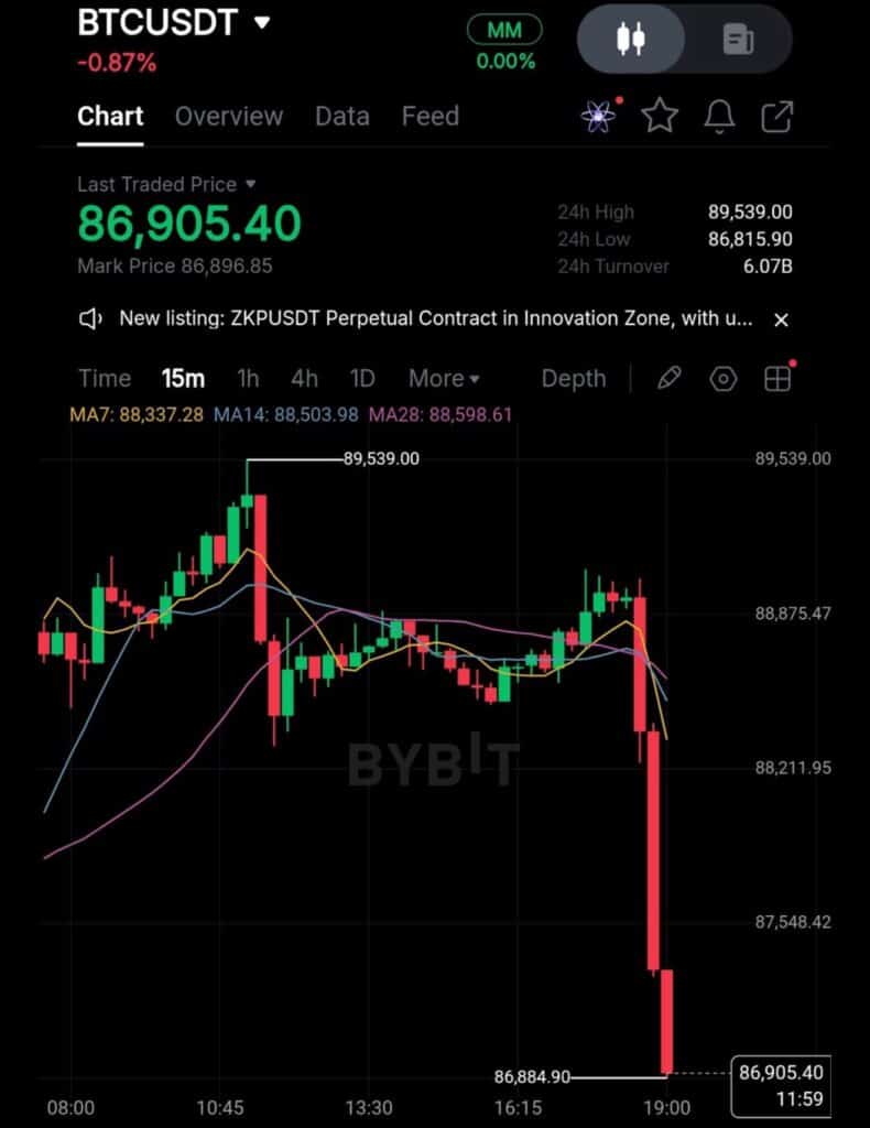 Z ostatniej chwili: Bitcoin spadł do 86 tys. USD w 45 minuut. ’70 mln USD w likwidacjach’. Idzie krach?