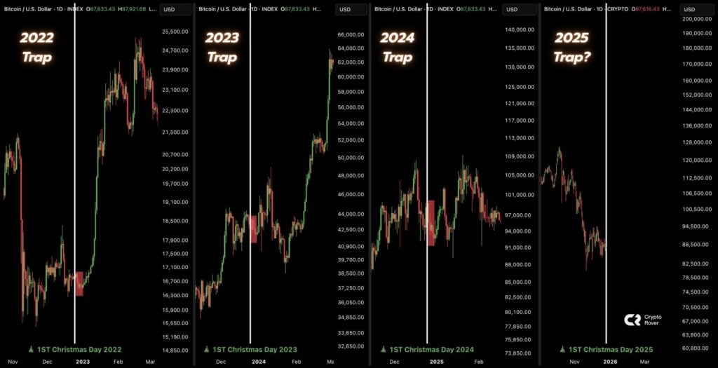 Napływy do funduszy ETF w ostatnich tygodniach były śladowe co potwierdza słabnące zainteresowanie Bitcoinem wśród 'dużych graczy’ jak i detalicznych adresów. Nic dziwnego, że święta Bożego Narodzenia przyniosły dziwne wydarzenia. Najpierw kilkusekundowy spadek z 89 tys. USD do ok. 24 tys. USD spowodowany załamaniem płynności, spowodowany dużymi zleceniami sprzedaży… Później kolejna już likwidacja optymistów. Czy BTC powtarza scenariusz bessy z 2022 roku?