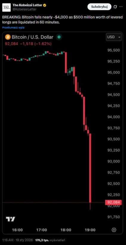 Otwarcie handlu w nocy z niedzieli na poniedziałek było bardzo burzliwe. Przekonali się o tym posiadacze Bitcoina, którego cena w ciągu kilkunastu minut spadła o ponad 4 tys. USD do ok. 92 tys. USD wobec przyspieszających spadków na amerykańskich indeksach giełdowych. Przypomnijmy, że w weekend Trump zagroził 10% cłami na 8 krajów Unii Europejskiej… Oraz wzrost taryfy celnej do 25%, jeśli umowa dot. zakupu Grenlandii nie zostanie sfinalizowana przed czerwcem 2026 roku.