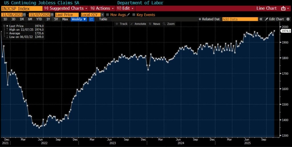 Wintermute zauważa, że inwestorzy funkcjonują obecnie w swoistej informacyjnej próżni. Fed dostaje sprzeczne sygnały z gospodarki, gdzie kontynuowane wnioski o zasiłek wzrosły do najwyższych poziomów od 2021 roku. Nie jest to tylko kwestia technicznego osłabienia czy nadmiernej spekulacji. To mieszanka wszystkiego.