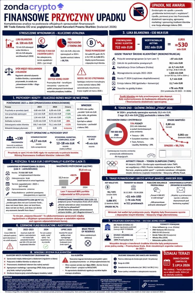 Czerwone flagi alarmowe zapaliły się już wcześniej. Firma od odzyskiwania kryptoaktywów Recoveris wykazała, że średni miesięczny stan bitcoinów w „gorących” (webowych) portfelach giełdy spadł z około 55,7 BTC w sierpniu 2024 roku do 0,18 BTC w marcu 2026 roku – o ponad 99 proc. Na początku kwietnia wartość ta wynosiła zaledwie 0,086 BTC, czyli przy ówczesnym kursie równowartość około 21 tysięcy złotych. Giełda deklarowała obsługę ponad miliona klientów, z czego pół miliona aktywnych.