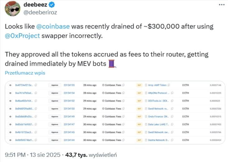Po zatwierdzeniu tokenów przez Coinbase do akcji wkroczył bot Maximal Extractable Value (MEV). W tym miejscu wyjaśnijmy, że boty MEV są programami, które skanują oczekujące transakcje w mempoolu (publicznym obszarze, gdzie transakcje czekają na potwierdzenie) i próbują wykorzystać okazje do zysku, często poprzez zmianę kolejności transakcji w bloku. W tym przypadku, bot „czekał w ukryciu”, jak to ujął Deebeez, wypatrując portfela o dużej wartości, który przypadkowo udzieliłby nieodpowiednich uprawnień. Marzenie bota się spełniło, gdy Coinbase zatwierdziło transakcję. Natychmiast po tym, bot MEV wywołał kontrakt „swapper”, aby przenieść wszystkie zatwierdzone tokeny z konta Coinbase na swoje własne adresy.