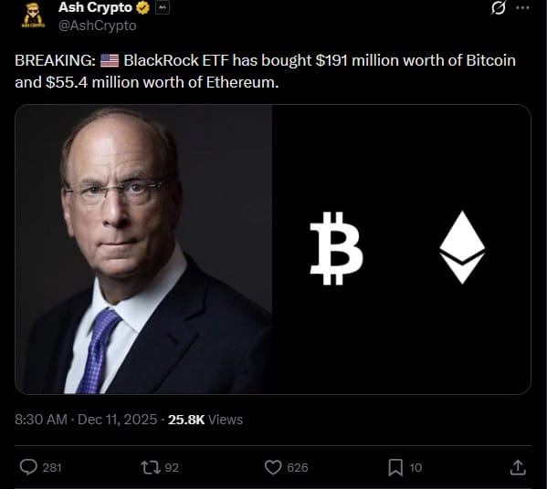 Jednak w ostatnim czasie gigant znowu dokupuje. Kilka godzin temu Ash Crypto poinformował na X, że BlackRock dokupił Bitcoina za 191 mln USD oraz Ethereum za 55,4 mln USD. To informacja, która poprawia nastroje na rynku, ale jest coś jeszcze.