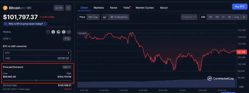 We wtorek wieczorem wartość Bitcoina spadła do czteromiesięczne minimum poniżej 100 000 dolarów. To sygnalizuje ponowną presję na rynku kryptowalut. Spadek, który doprowadził do osiągnięcia przez BTC 98 900 dolarów przed niewielkim odbiciem, wywołał niepokój wśród posiadaczy kryptowalut, którzy obawiają się dalszego wzrostu.