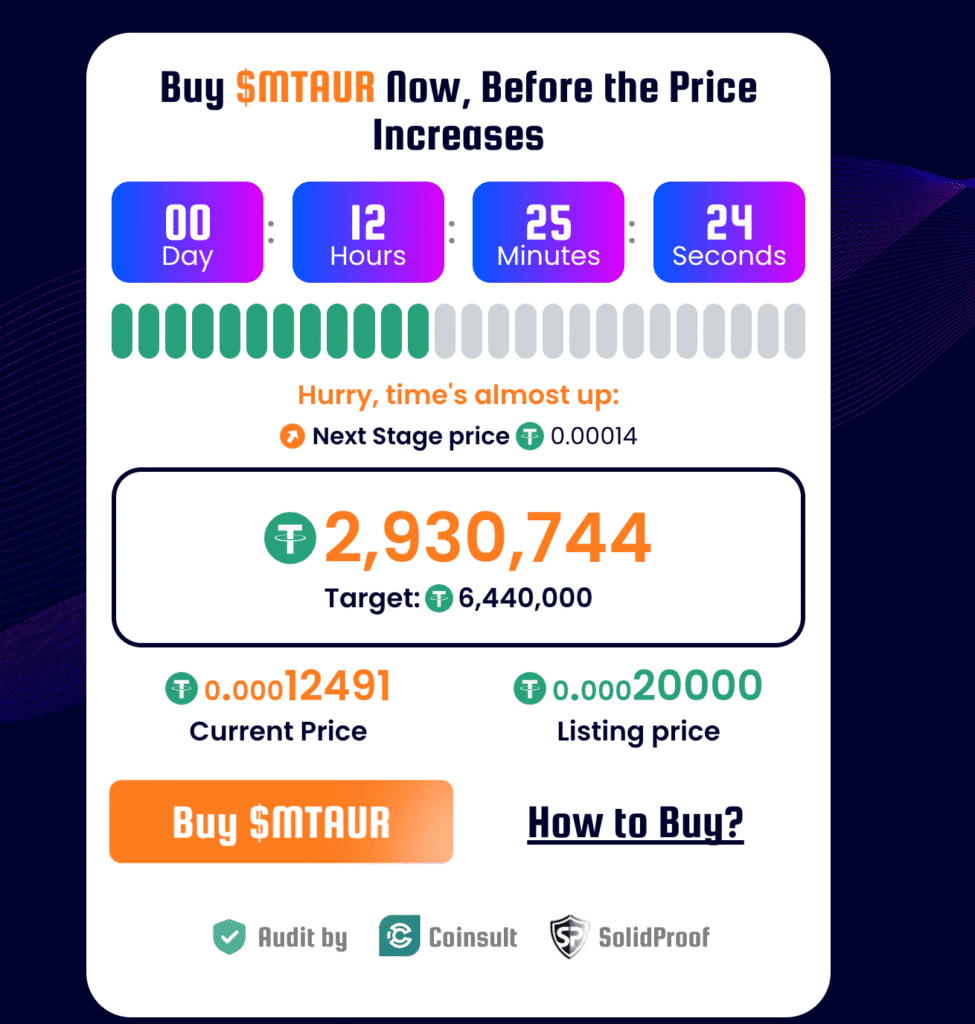 - Utrzymująca się dynamika cen – Pomimo zmienności kryptowalut, cena MTAUR nie spadła od momentu premiery, kontynuując stabilną trajektorię wzrostową, która odzwierciedla rosnące zaufanie i zainteresowanie rynkiem.