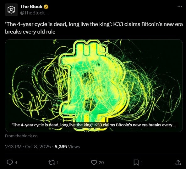 Taką tezę stawia zespół analityków K33. Podczas gdy wielu obserwatorów i ekspertów ostrzega, że hossa dla BTC, zgodnie ze starymi wzorami, dobiega końca, eksperci tej firmy przedstawiają zupełnie inną wizję. Analitycy K33 twierdzą, że od co najmniej kilku miesięcy obserwujemy fundamentalne zmiany, które mają być dowodem na to, że tzw. 4-letni cykl Bitcoina przestaje obowiązywać.
