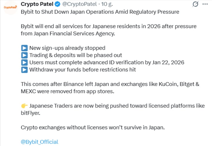 Na platformie społecznościowej X ekspert rynkowy znany jako Crypto Patel podkreślił że proces wycofywania się Bybit z Japonii będzie rozłożony w czasie aby umożliwić użytkownikom bezpieczne zamknięcie pozycji. Osoby które zostały błędnie zaklasyfikowane jako rezydenci Japonii mają czas do 22 stycznia 2026 roku na przeprowadzenie zaawansowanej weryfikacji tożsamości poziomu drugiego.