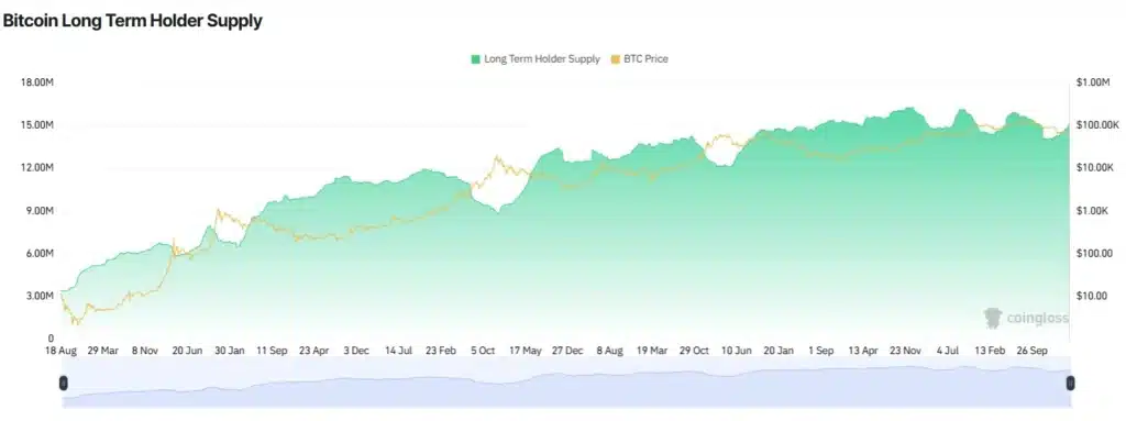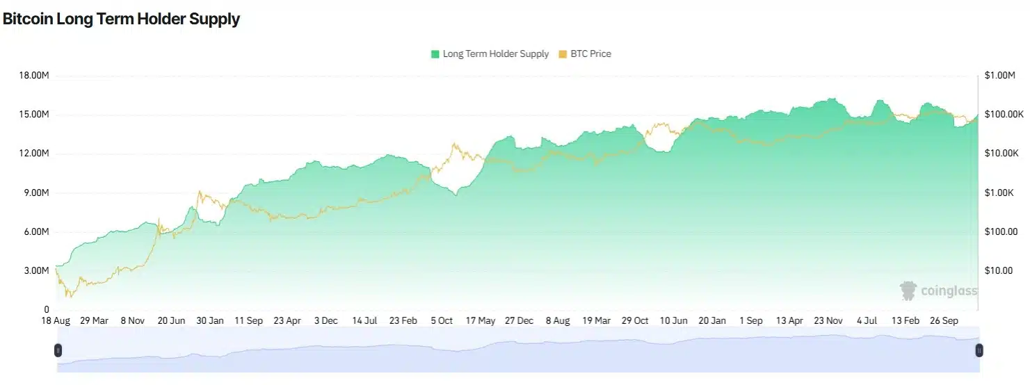 Wskaźnik BTC Long-Term Holder Supply od ostatniego gwałtownego spadku z przełomu października i listopada stopniowo się odbudowuje. Wykres CoinGlass pokazuje, że od tamtego momentu liczba długoterminowych posiadaczy systematycznie rośnie. Grupa ta powiększyła się o prawie miliony takich posiadaczy, z 14 do 14,99 milionów.
