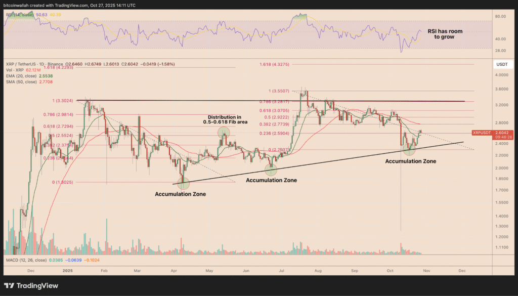 Ta siła w łańcuchu bloków wspiera byczą konfigurację techniczną. Cointelegraph ujawnił notatki, z które pokazują, że niedawne odbicie XRP od długoterminowej, rosnącej linii trendu odzwierciedla fraktalne wzorce z kwietnia i czerwca 2025 r. Jeśli ten fraktal się powtórzy, analitycy prognozują, że cena może osiągnąć poziom 0,5–0,618 Fibonacciego na poziomie 2,75–3,00 USD w listopadzie. To oznacza potencjalny wzrost o 12–18%. Ten ruch może zostać wzmocniony przez krótkie pozycje. Dane Coinglass pokazują duże skupisko płynności krótkich pozycji (wartość ~15,91 mln USD) koncentrowała się wokół poziomu 2,68 USD.