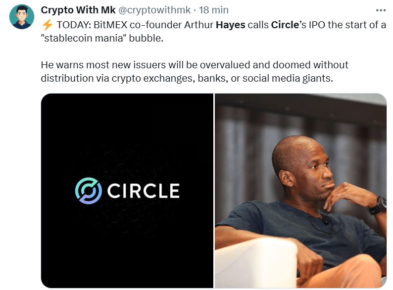 Circle wszedł na giełdę i od razu zaliczył 80% wzrostu. Sukces? Dla nich tak. Ale dla Arthura Hayesa, założyciela BitMEX-u, to dopiero początek… spektaklu. I, przynajmniej jego zdaniem, nie będzie to widowisko najwyższych lotów. „To nie koniec tego cyklu manii na stablecoiny. To dopiero jej początek” – pisze w najnowszym poście, sugerując, że już za chwilę rynek zaleje fala „Circle copycatów”. Czyli spółek, które będą próbowały powtórzyć sukces Circle, ale zamiast tego pogrążą inwestorów.