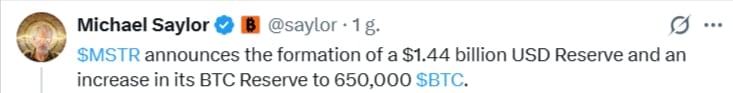 Dzisiejszy dzień przyniósł kolejną przełomową wiadomość – Strategy poinformowało bowiem o utworzeniu rezerwy dolarowej w wysokości 1,44 miliarda USD. Informację przekazał na X sam Saylor: