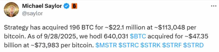 W dniach od 22 do 28 września br. Strategy nabyło dodatkowe 196 BTC za około 22,1 miliona dolarów, po średniej cenie 113 048 dolarów za Bitcoina. Zakup ten spowodował zwiększenie łączne zasoby firmy do niewiarygodnych 640 031 BTC. Ta suma, warta około 71,8 miliarda dolarów, została zakupiona po średniej cenie 73 983 dolarów za Bitcoina, co oznacza całkowity koszt około 47,4 miliarda dolarów. Jak wskazał Saylor, jest to ogromny „papierowy zysk” w wysokości około 24,4 miliarda dolarów.