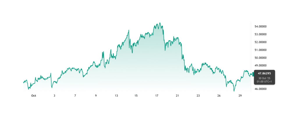 W jakiej się zatem sytuacji znajduje? We środę srebro ostro, choć bardzo daleko odbiło w górę. W ciągu dnia zyskało 2,6%, osiągając poziom 48,12 dolara za uncję. Zniwelowało w ten sposób część strat z poprzednich dziesięciu dni – w toku których notowania obserwowały odwrót od historycznego rekordu, czyli cenowego ATH na poziomie 54,45 dolara za uncję – i odbiło się od minimalnego poziomu zanotowanego w październiku (45,68 dol.).
