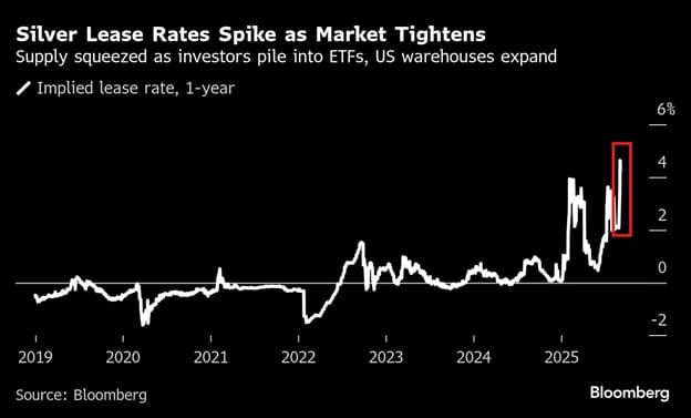 Coś w tym rynku „nie gra”. Spready między Londynem a Nowym Jorkiem potrafią sięgać nawet 1,20 dolara na uncję. Różnica trudna do wytłumaczenia w normalnych warunkach. Do tego dochodzi koszt pożyczania srebra w Londynie. Ten już piąty raz w tym roku wystrzelił ponad 5%. Jeszcze dekadę temu takie stawki uchodziłyby za aberrację. To nie są już kosmetyczne wahania. To sygnał, że fizycznego kruszcu zaczyna brakować tam, gdzie zwykle był w nadmiarze.