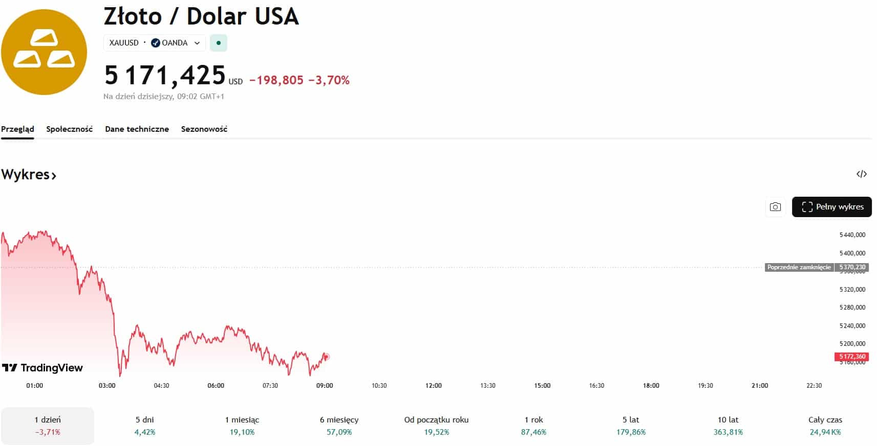 W czwartek rynek złota był niczym rollercoaster. Najpierw było mocne otwarcie, po którym cena złota przekroczyła 5600 dolarów za uncję. Kiedy wydawało się, że złoto walczy o przełamanie kolejnego poziomu oporu, nagle przyszła nieoczkiwana obniżka kurus. Cena złota spadła o 380 dolarów, czyli prawie 7%, w ciągu zaledwie 28 minut. Szybkość i skala wyprzedaży zaskoczyła nawet najbardziej doświadczonych obserwatorów rynku metali szlachetnych i zmusiła do refleksji na temat ewentualnego końca hossy na złocie.