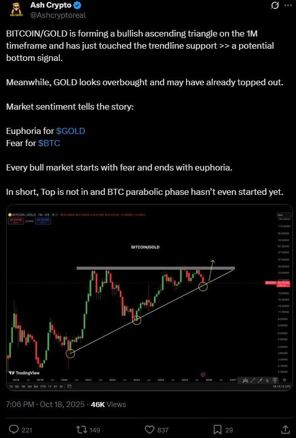 Tymczasem Joao Wedson, analityk CryptoQuant, w jednym z najnowszych wpisów na X daje dość zaskakująco radę. Ekspert ocenia, że obecnie utworzyła się „historyczna okazja” i pisze wprost: „Wymień złoto na Bitcoina”.