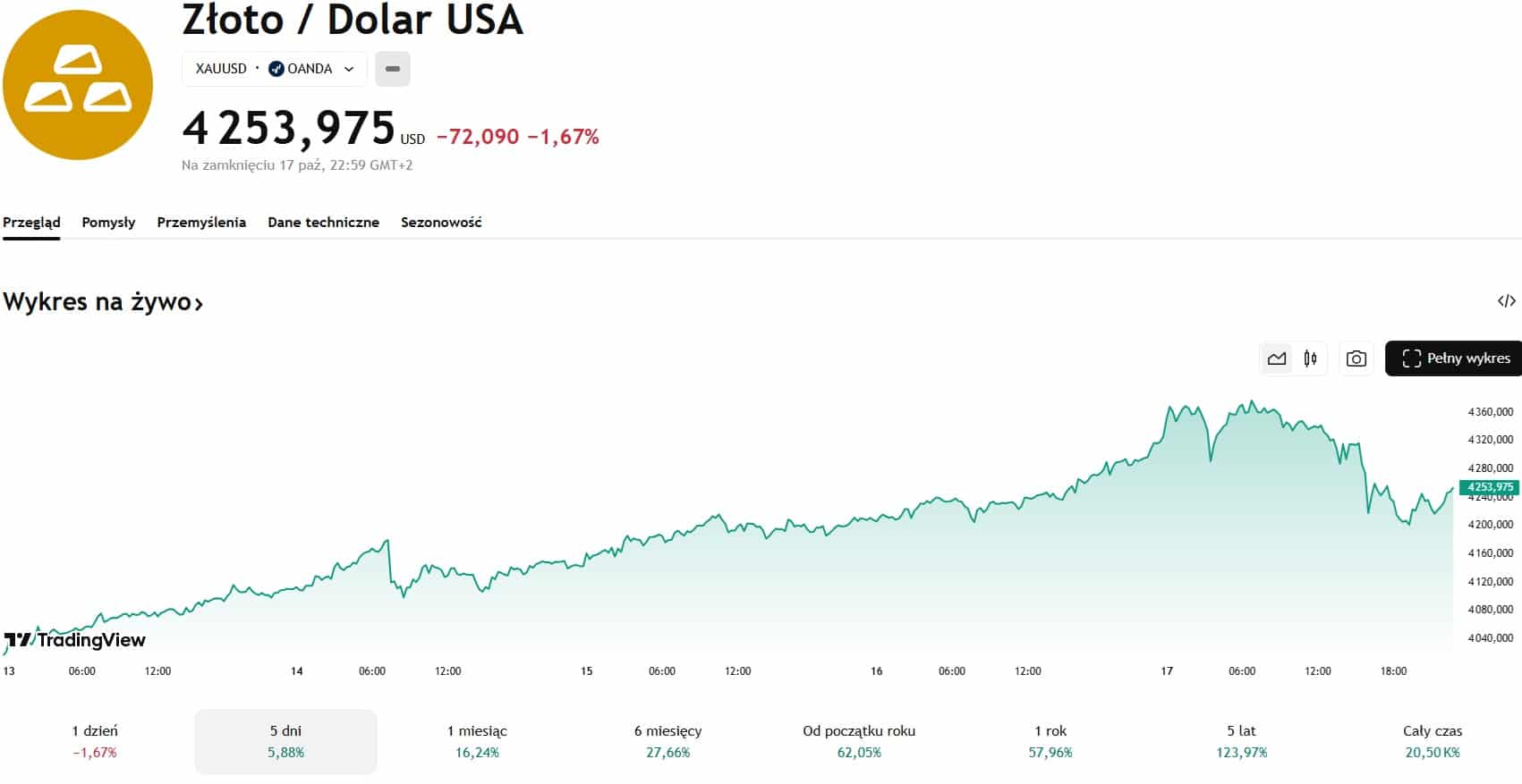 Metal osiągnął kolejne rekordowe ceny. W chwili pisania tekstu złoto kosztuje 4253 dolary, a w ciągu ostatnich 24 godzin nieco wytraciło impet i straciło 1,67%. Jednak przez cały miniony tydzień metal podrożał o 5,88%. Z kolei przez cały ostatni miesiąc wartość złota wzrosła o 16,24%. Natomiast od początku roku złoty kruszec zyskał na wartości już 62,05%.