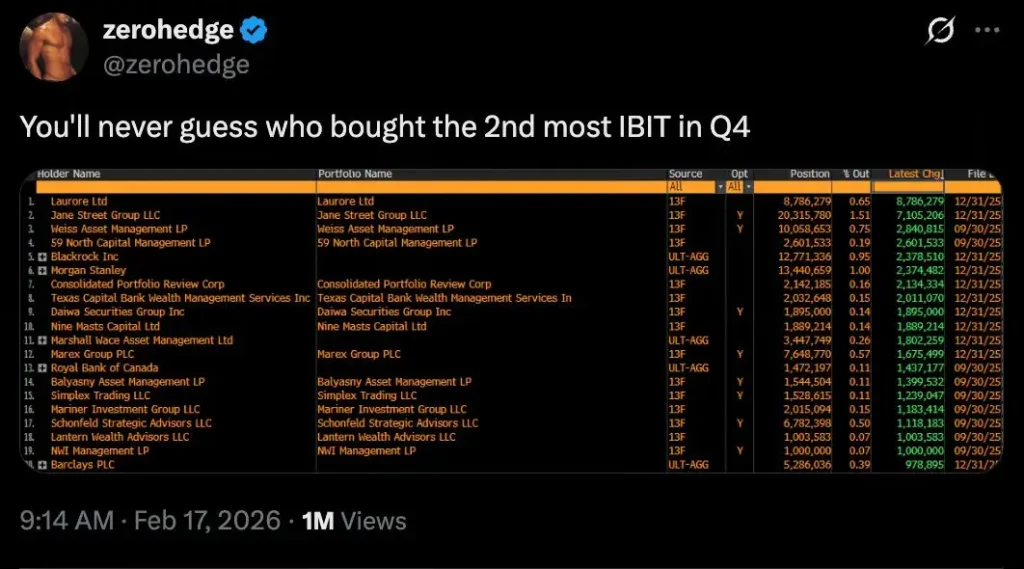 Równolegle analitycy śledzą nietypową strategię Jane Street polegającą na jednoczesnej sprzedaży Bitcoina w newralgicznych momentach sesji amerykańskiej … Oraz agresywnym zwiększaniu pozycji w akcjach Strategy, dawniej MicroStrategy, kierowanej przez Michaela Saylora. Spółka ta, posiadająca setki tysięcy BTC, funkcjonuje jak lewarowany instrument pośredni na cenę Bitcoina. W czwartym kwartale 2025 roku Jane Street zwiększyła swoje zaangażowanie w MSTR o 473%. W tym czasie inni, duzi gracze rynku ograniczali ekspozycję.