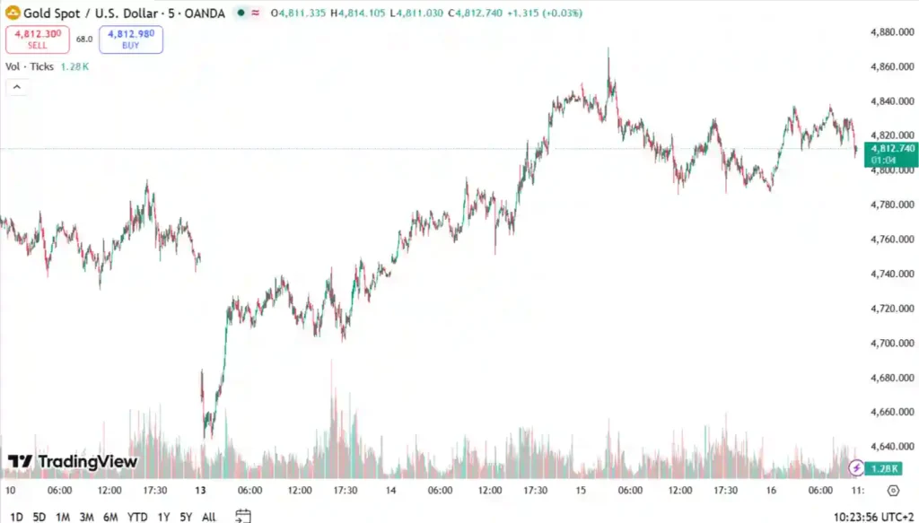 Notowania złota znajdują się obecnie w kluczowym punkcie zwrotnym, a inwestorzy z niepokojem obserwują okolice psychologicznego poziomu 5000 USD za uncję.
