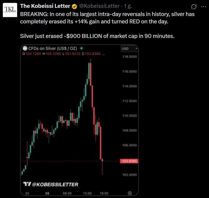 Łączna skala spadku kapitalizacji srebra i dużo większego złota wyniosła 1,7 biliona dolarów. Wszystko to w ciągu 1,5 godziny, ale jeśli dodamy do tego platynę i pallad, które również potężnie traciły, skala zbliża się do 2 bilionów USD. Złoto cofnęło się do około 5000 USD za uncję, a srebro testuje okolice 100 USD. W obu przypadkach to istotne, psychologiczne poziomy.