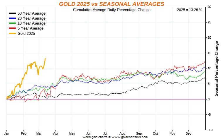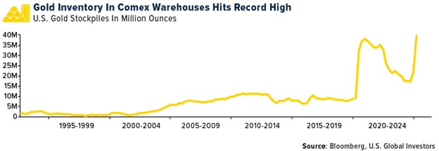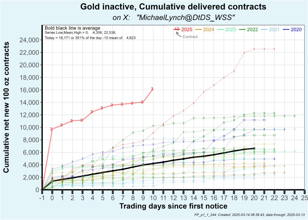 Od rozpoczęcia gwałtownego popytu na fizyczneg dostawy złota w okolicach 10 grudnia 2024, wszystkie trzy kontrakty terminowe (styczeń, luty, marzec) ustanowiły rekordy pod względem realizacji fizycznych dostaw. Tylko luty był aktywnym kontraktem. Ta trzymiesięczna fala zakupów może być niedoszacowana. Piątkowy handel kontraktem marcowym na złoto w COMEX rozpoczął się od otwartego zainteresowania na poziomie zaledwie 73 kontraktów.