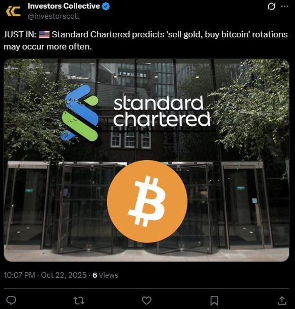 Geoffrey Kendrick, analityk Standard Chartered, powiedział, że stale monitoruje przepływ ze złota do BTC. Jak zauważył, gwałtowna wyprzedaż złota na początku tego tygodnia zbiegła się z odbiciem Bitcoina. Ekspert nazwał to zjawisko „sprzedaj złoto, kup Bitcoina”. Kendrcik dodał, że bank spodziewa się więcej takich transferów w kolejnych dniach.