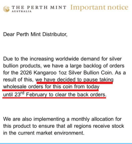 Czy to koniec rajdu srebra i złota? Niekoniecznie. Od jednego z polskich dystrybutorów metali szlachetnych otrzymaliśmy informację, że The Perth Mint ma duży backlog zamówień na popularną monetę bulionową Kangaroo 1 oz na 2026 rok i czasowo wstrzymuje przyjmowanie zamówień hurtowych, wdrażając jednocześnie miesięczną alokację (racjonowanie dostaw między regiony). Na stronach produktowych mennicy widnieją ostrzeżenia o opóźnieniach w realizacji z powodu wyjątkowo wysokiego popytu.