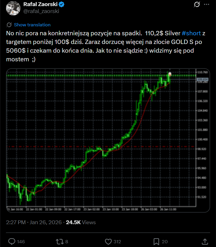 Zaorski nie ukrywa swoich zamiarów ani skali ryzyka. Deklaruje krótką pozycję na srebrze w rejonie 110,2 dolara z celem poniżej 100 dolarów, równolegle dokładając shorty na złocie w okolicach 5 060 dolarów. Podkreśla przy tym, że to trzecie podejście do tego zagrania w obecnym ruchu, co samo w sobie mówi sporo o trudności tej strategii. Dodał też wymowne 'widzimy się pod mostem’, jeśli i tym razem jego spekulacyjna pozycja nie przyniesie zysków.