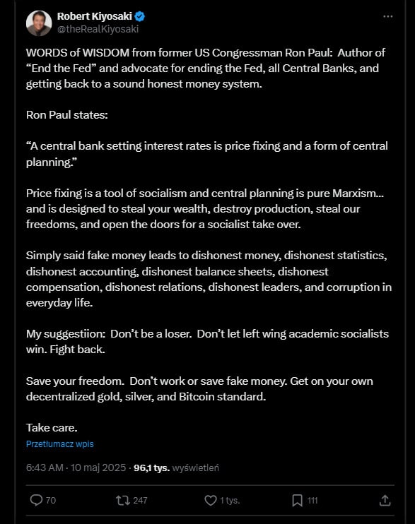 Nowy wpis Kiyosakiego na X jest inspirowany słowami Rona Paula – znanego libertarianina i autora książki „End the Fed” – wywołał poruszenie zarówno wśród zwolenników kryptowalut, jak i inwestorów zainteresowanych złotem i srebrem.