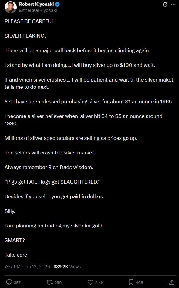Kiyosaki szybko zareagował na wzrosty i odniósł się do jednego z pytań, które zadaje sobie teraz niejeden inwestor – „Czy jest za późno na zakup srebra”. Robert Kiyosaki nie ma wątpliwości, że nie. W jednym z ostatnich wpisów na X stwierdził, że gdyby był na miejscu tych osób, kupiłby, zanim kurs osiągnie 100 dolarów.