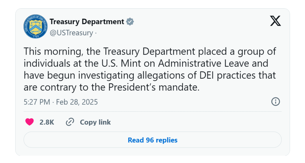 W rezultacie skargi, którą złożył jeden z pracowników mennicy, którego przesunięto na inne stanowisko, by zwolnić miejsce dla urzędników odpowiedzialnych wcześniej za DEI, sprawa nabrała publicznego rozgłosu. Departament Skarbu ogłosił, że zawiesił w obowiązkach grono osób na kierowniczych stanowiskach w US Mint i rozpoczyna postępowanie w sprawie mających w mennicy miejsce praktyk.