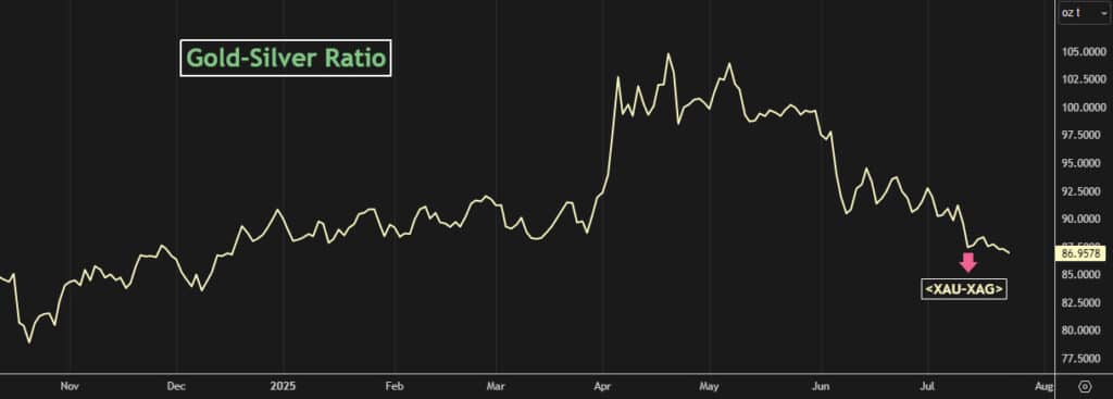 Równie interesujące jest to, jak zachowuje się relacja cenowa między srebrem a złotem. Obecnie potrzeba „zaledwie” 87 uncji srebra, by kupić jedną uncję złota. Jeszcze w kwietniu ten stosunek wynosił 105:1. To największe zbliżenie między tymi dwoma metalami od grudnia ubiegłego roku. Historycznie, taka kompresja często zapowiadała dalsze wzrosty srebra (lub korektę na złocie).