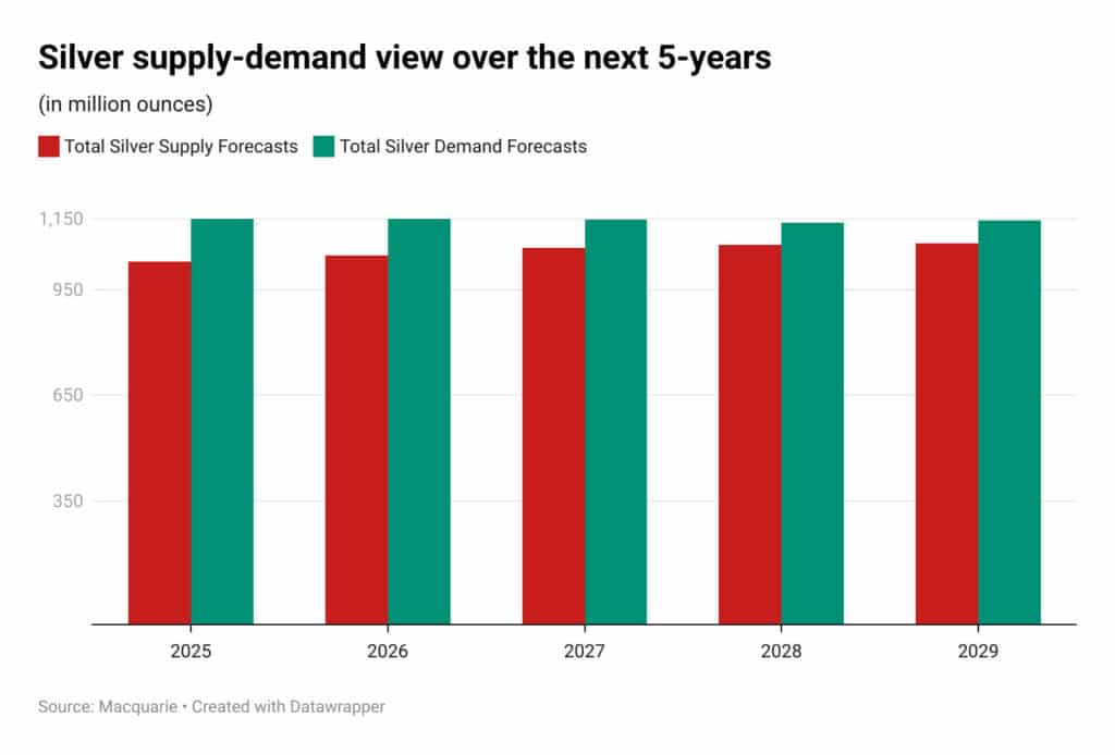 Warto jednak zauważyć, że tegoroczna hossa na srebrze nie opiera się wyłącznie na spekulacyjnej fali wywołanej polityką nowej administracji USA. To już piąty rok z rzędu, w którym globalny rynek srebra balansuje na granicy niedoboru. Jak pokazaliśmy wyżej popyt istotnie przewyższa podaż. Nie tylko z powodu inwestorów szukających alternatywy dla złota.