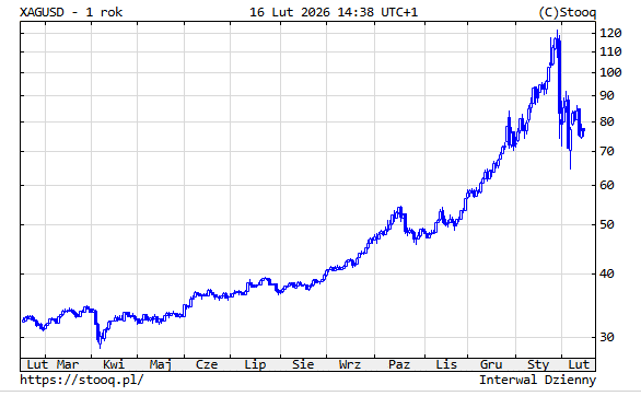 Sztuczna inteligencja: Srebro wchodzi w drugą połowę lutego 2026 po wyjątkowo nerwowym okresie. Cena spot oscyluje dziś w rejonie ~75–77 USD za uncję, po gwałtownym spadku z bardzo wysokich poziomów ze stycznia (rynek w krótkim czasie przeszedł od euforii do „risk-off”). To ważne, bo srebro — w przeciwieństwie do złota — jest mocniej „podpięte” pod cykl gospodarczy (duża część popytu to zastosowania przemysłowe), więc w fazach delewarowania i ucieczki od ryzyka potrafi zachowywać się ostrzej niż złoto.