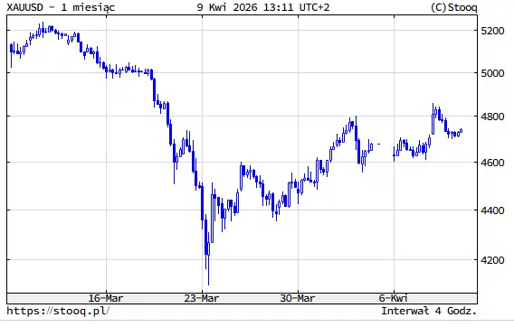 ChatGPT: Na 9 kwietnia 2026 r. złoto na rynku spot kosztuje około 4715 dolarów za uncję, a kontrakty terminowe na złoto w USA wyceniają je na ok. 4739 dolarów. Reuters podkreśla, że rynek jest ostrożny: po odbiciu związanym z rozejmem między USA i Iranem inwestorzy znów skupili się na inflacji i ścieżce stóp procentowych w Stanach Zjednoczonych.