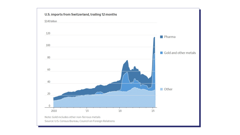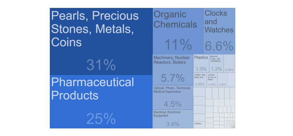 Tymczasem z początkiem kwietnia tego roku okazało się, że nic takiego nie będzie. Złoto zostało wyłączone z planowanych przez Trumpa ceł. Entuzjazm rynkowy opadł – w międzyczasie jednak do Ameryki trafić miało 26,5 mln uncji złota (a także 174,6 mln uncji srebra). Co z tym wszystkim ma jednak wspólnego Szwajcaria? To, że ten alpejski kraj stanowił pośrednika w odniesieniu do znacznej części tych transakcji. Nawet zresztą normalnie kosztowności stanowią formalnie największa pozycję jego eksportu.