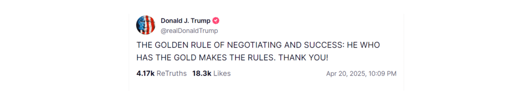 Co więcej, oznacza to, że w toku bieżącego, 2025 roku umocniło się ono już o 29% procent. I nic nie wskazuje na to, aby długofalowo ceny te miały zacząć spadać – a wprost przeciwnie. Impulsem do najnowszego zamieszania cenowego wokół kruszcu mógł być w sumie niepozorny wpis Trumpa na jego portalu TruthSocial. Który to jednak wpis może sugerować politykę amerykańskiego prezydenta w odniesieniu do roli złota w handlu i ekonomii.
