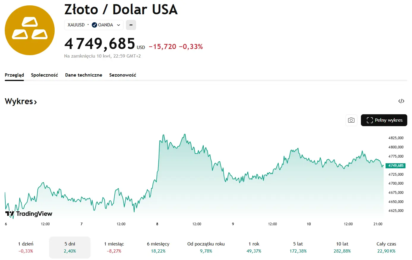 Na koniec tygodnia handlowego między 6 a 10 kwietnia złoto kosztowało 4749 dolarów za uncje. Pomimo spadków w piątek (-0,33%), ostatecznie metal po całym tygodniu zyskał na wartości 2,40%. W ujęciu miesięcznym strata wynosi 8,40%. Pomimo dużych spadków, od początku roku (Year To Date) metal zyskuje na wartości 9,78%.