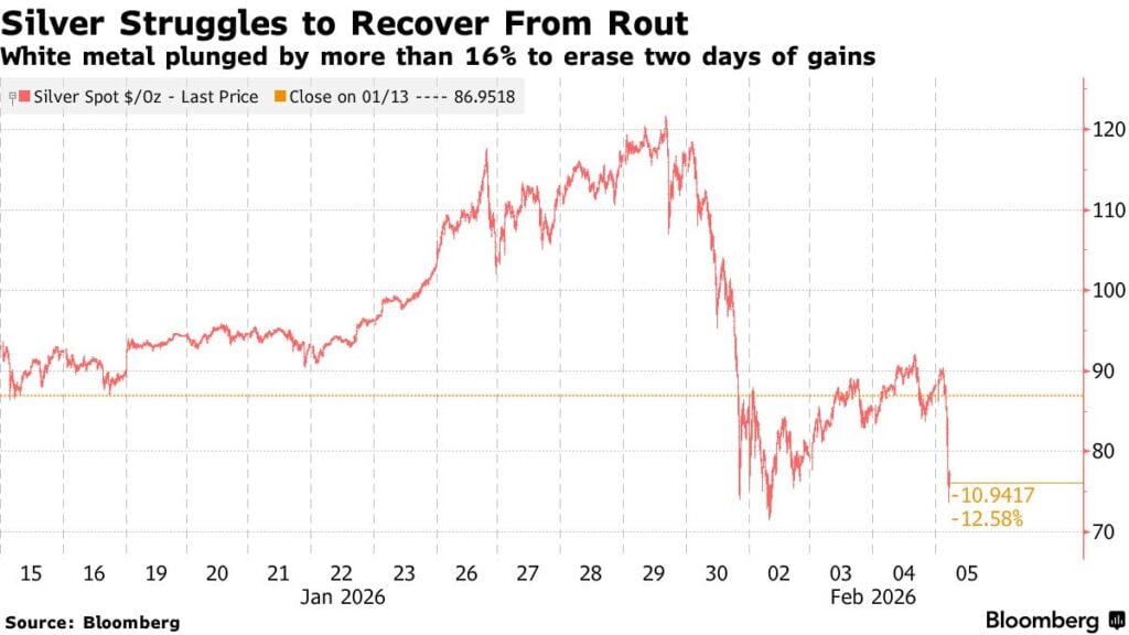 Czwartkowa sesja w Azji przyniosła gwałtowną wyprzedaż, która w pewnym momencie niemal całkowicie zniosła dwudniowe odbicie cen. Notowania spot srebra spadły chwilowo nawet o 17 procent w okolice 73 dolarów za uncję, zanim rynek próbował znaleźć tymczasowe wsparcie. Od zeszłotygodniowego historycznego szczytu metal stracił już ponad jedną trzecią wartości, co pokazuje skalę przegrzania wcześniejszego rajdu.