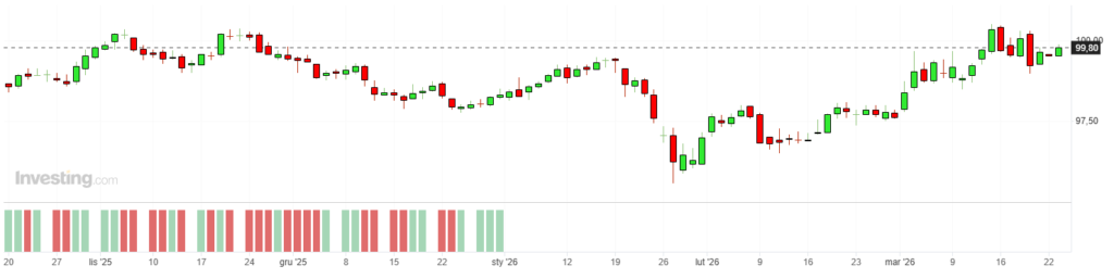 Dzisiejszy ruch wygląda na pierwszy rzut oka paradoksalnie. W normalnych warunkach wojna i ryzyko na Bliskim Wschodzie powinny pomagać złotu. Tym razem rynek uznał jednak, że ważniejsze są drożejąca ropa, mocniejszy dolar i rosnące rentowności amerykańskich obligacji. Brent utrzymywał się dziś powyżej 110 dolarów za baryłkę, dolar zyskiwał, a rentowność amerykańskich dziesięciolatek doszła do najwyższych poziomów od miesięcy. To zestaw wyjątkowo niekorzystny dla aktywów, które nie płacą odsetek.